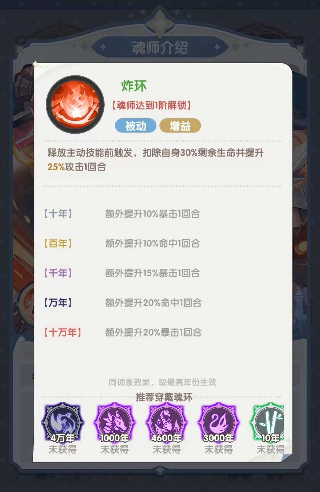 其第一个被动技能“炸环”,可在释放主动技能前触发,通过扣除大量当前生命值来大幅提升攻击力,并额外获得暴击率与命中率加成。这种以伤换伤的机制极大增强了爆发能力,但也要求队伍中必须配备具备强力治疗能力的辅助角色,否则唐昊极易因血量过低而提前退场。
