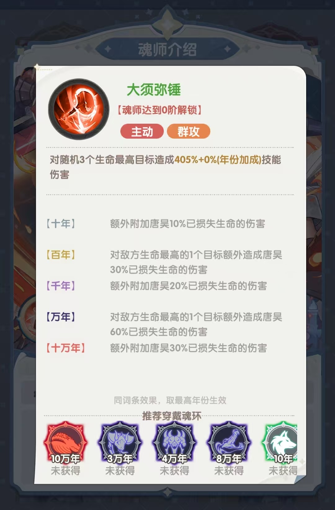作为典型的强攻系魂师,唐昊的主动技能“大须弥锤”具备强大的群体打击能力,可随机锁定三个生命值最高的敌方单位造成高额伤害。其伤害机制与自身已损失的生命值百分比挂钩,血量越低,附加输出越高,同时对三人中血量最高的目标额外提升伤害。这一特性使其在对抗敌方前排高血量坦克时尤为高效,能够迅速瓦解对方防线。