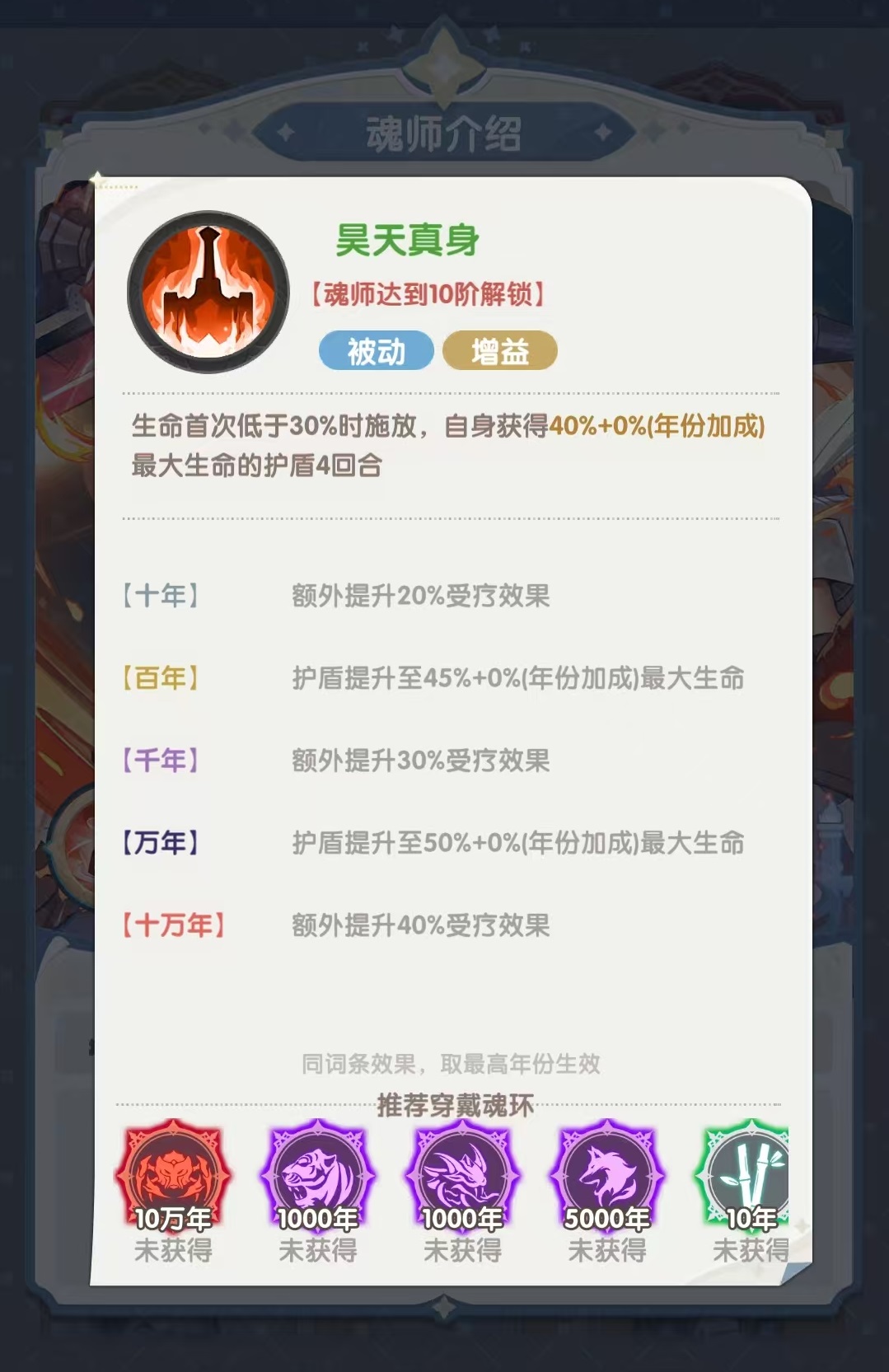 第三个被动“昊天真身”在唐昊生命值首次低于30%时激活,为其施加一个高额护盾,魂环年限提升后还可增强受疗效果。此技能有效提升了残血生存能力,配合阿银形成完美联动。阿银作为当前版本最强治疗型魂师,能快速为唐昊恢复生命值,弥补其高风险输出带来的续航问题。两人还可触发武魂融合技“昊天生辉”,为全队提供大量护盾并实现每回合持续回血,极大增强团队持久作战能力。