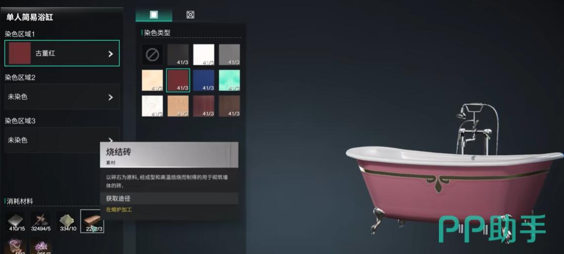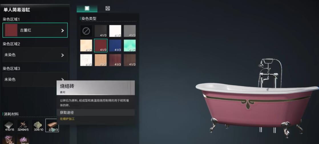 染色家具其实很简单,先进入设计台选择染色功能,点击目标家具后弹出配色界面。左侧选择预设配色方案或手动调整RGB值,右侧显示所需材料。放入变异藏红花与星辰染料,确认后生成染色成品。新染色的浴缸可随时摆放或收回仓库,重新染色无需额外消耗材料。染色后的家具会保留原始功能,仅改变外观。通过反复调整颜色,玩家能低成本尝试不同风格。建议先对小型家具(如灯具、地毯)试色,再逐步调整大型家具(如床、柜子),避免材料浪费。