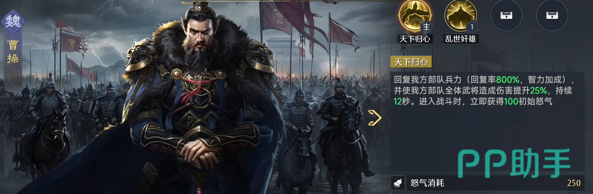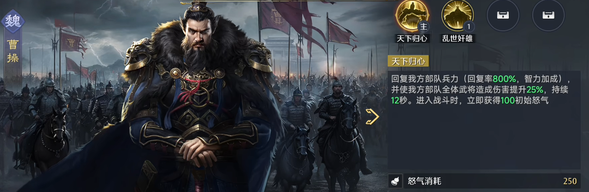 作为魏国阵营的核心统帅,曹操在技能设计上充分体现了其领袖气质。其主动技能可在释放时使我方全体单位攻击力提升25%,并恢复周围单位的生命值,兼具爆发增强与续航支持,极大提升了团队持续作战能力。