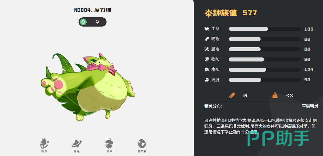 在《洛克王国》新手入门阶段,草系精灵的选择往往关系到前期推图效率与队伍构建的稳定性。若你正寻找一只兼具成长潜力与实用性的草系伙伴,魔力猫无疑是一个值得关注的优质选项。其总种族值稳定维持在577点,在当前版本中属于中上水准;尽管编号靠前、获取门槛较低,但实际使用率并不高,这意味着它尚未被广泛开发,存在较大的战术挖掘空间。