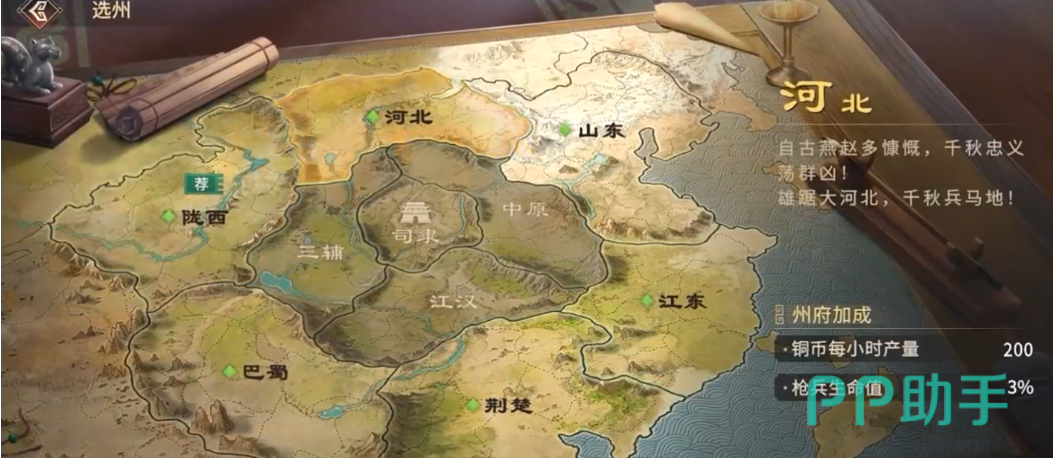 河北位于广袤平原之上,河网密布,地理条件优越。此地以铜币产出见长,每小时多产200铜币,虽单次增量不高,但在长期科技研发与士兵训练中具有显著累积优势。同时,河北能提升枪兵3%的生命值,使其在前线对抗中更具生存能力,适合注重持久作战的玩家选择。