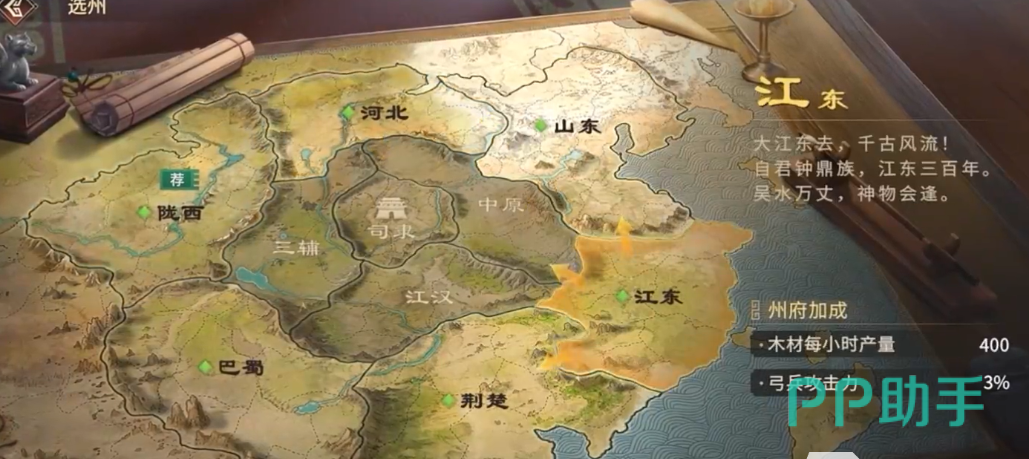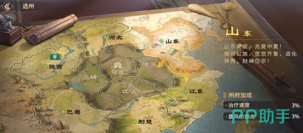 山东地形融合平原与丘陵特征,拥有稳定的后勤支持能力。其核心优势在于提升3%的部队治疗速度,并同步增强盾兵3%的防御力。这一组合使得战斗后的恢复更高效,前排单位也能在高强度对抗中坚持更久,非常适合主打防守反击或阵地战的玩家。