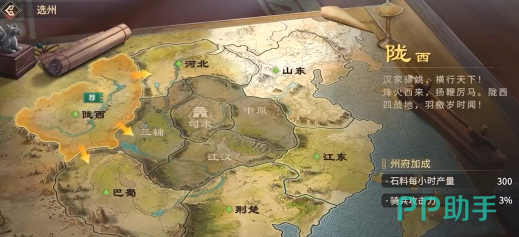 陇西地处高原与山地交界地带,地形复杂但石料储备丰富,是石料产出的核心区域,每小时可额外获得300以上的石料产量,极大缓解前期建筑升级时的材料压力。在兵种方面,该地为骑兵提供3%的攻击力加成,适合偏好高速突袭与冲锋作战的玩家优先考虑。