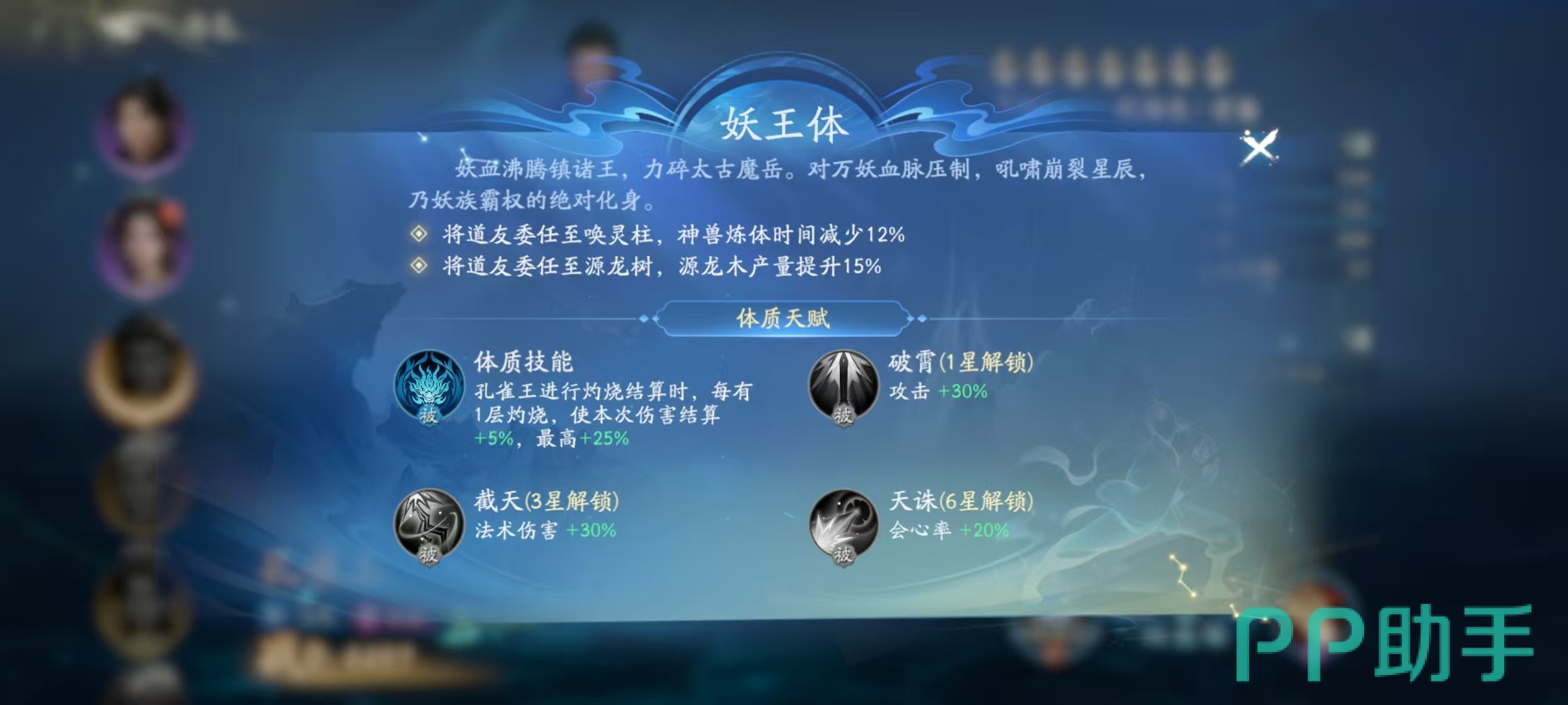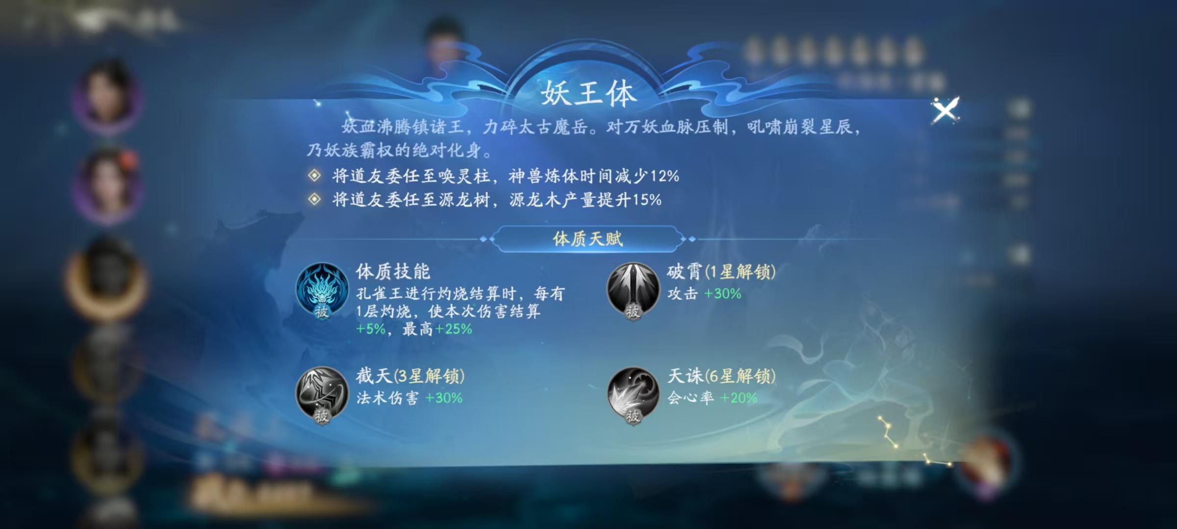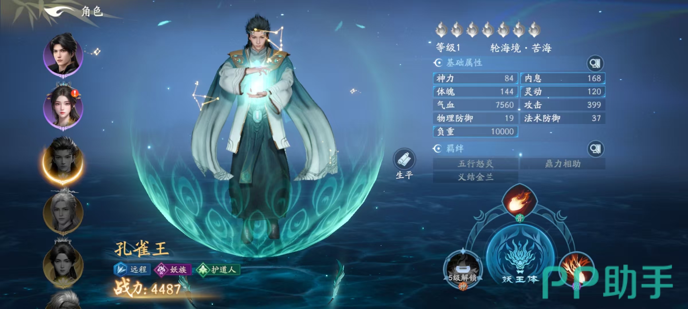 在职业体系中,孔雀王被明确划分为远程法术输出型单位,阵营归属为妖族,专属羁绊为“护道人”。该羁绊具有明确的触发阈值:当队伍中同时上阵两名护道人时,每存活一名可为全体友方单位提供3%物理防御与3%法术防御加成;若达成三名护道人齐出,则在任一友方单位首次血量跌破50%时,触发“双段增伤”效果——后续连续两次攻击或法术伤害提升40%。此外,孔雀王拥有“妖王体”体质,其被动效果体现于资源建筑委任:委任至唤灵柱可缩短神兽炼体时间12%;委任至源龙树则提升源龙木产量15%。