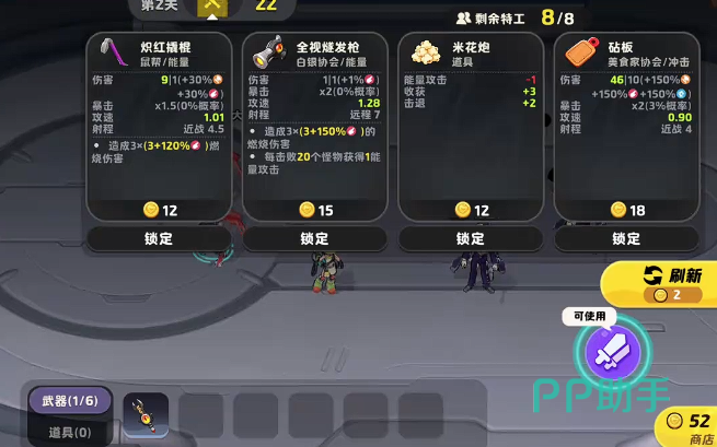 装备栏初始提供2个武器槽位,可部署双武器组合实现稳定输出;自第6回合起,栏位扩展至满额6格,支持构建多维度火力体系。商店刷新机制影响关键装备获取节奏——首回合即有概率直接刷出5费强力武器(如激光伐木炮),无需升级商店即可入手,但该概率随回合推进逐步降低,故前期需主动消耗多余金币刷新,提高高价值武器命中率。