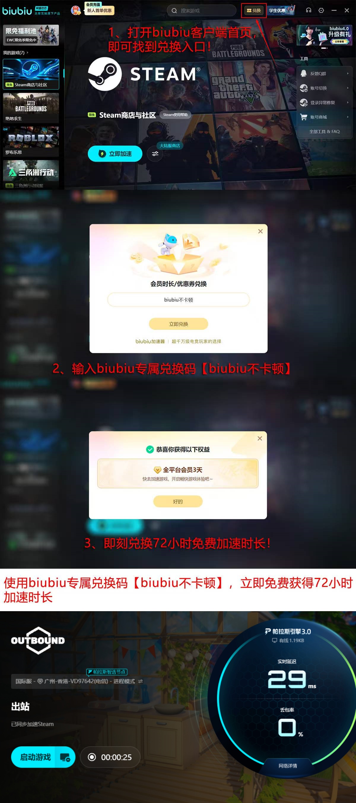 针对新用户,biubiu加速器提供友好入门机制:首次启动即赠送24小时全节点通用加速时长;输入专属兑换码【biubiu不卡顿】,还可额外激活3天连续加速权益,无需绑定支付方式即可立即启用。