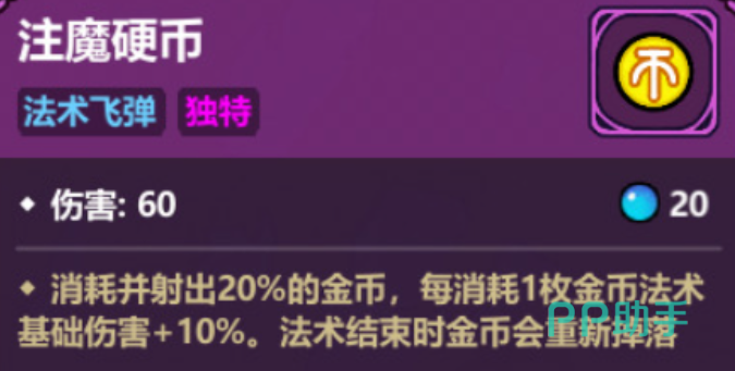 注魔硬币是一种法术类远程攻击手段,其核心机制是将角色持有的硬币作为弹药发射出去,形成飞弹形式的持续伤害。该流派的特点在于——拥有的硬币数量越多,可触发的攻击次数也就越多,属于典型的后期成型体系。每次发射时,有20%的概率触发金币特效,且每消耗一枚金币,法术伤害就会提升10%。值得注意的是,在法术释放结束后,已使用的金币会重新掉落至地面,可供再次拾取使用,从而实现资源循环。