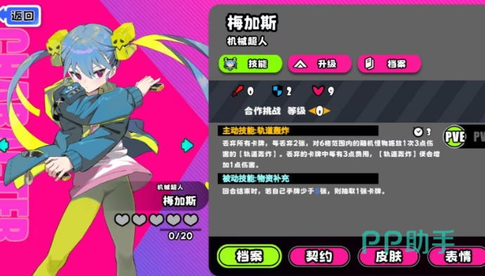 在合作模式下,梅加斯的定位转向功能性辅助。她的轨道轰炸可配合队友接战节奏,高效削减精英怪或Boss血量;被动效果则提供稳定的过牌保障——只要手牌数不足5张,每回合自动补充1张,确保弃牌链持续运转。此外,通过升级可提升基础生命值,强化生存容错;而其核心收益路径始终围绕星币获取展开,因此常作为队伍中的经济引擎部署于生存位。