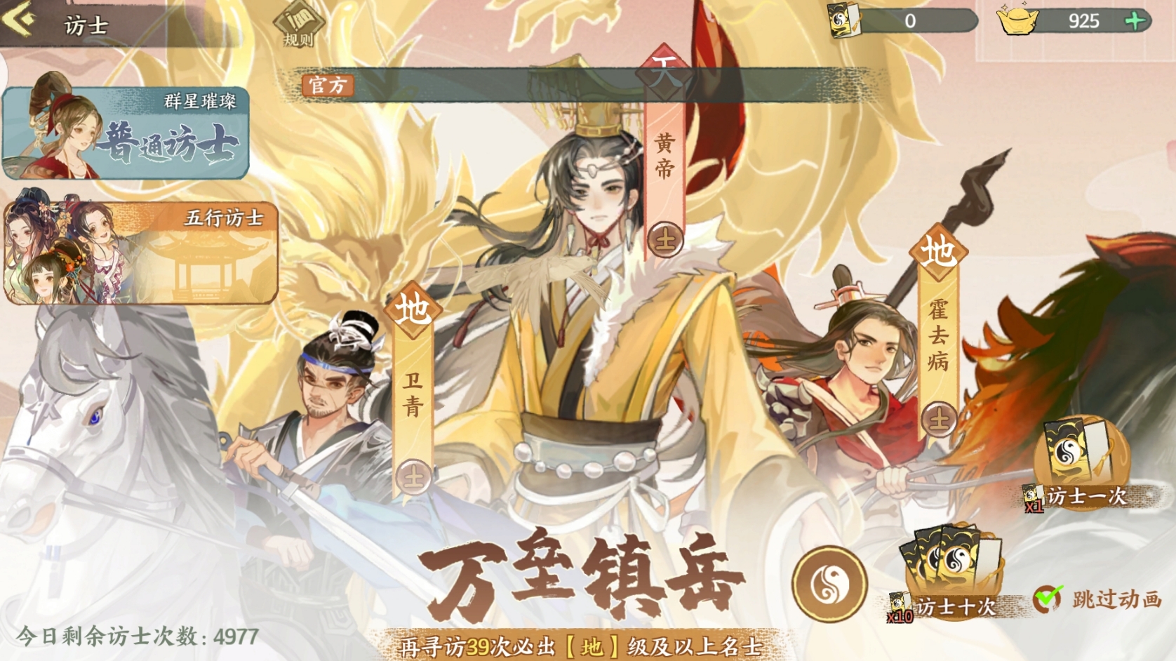 五行访士则主打属性定向抽取机制。玩家在首次进入该卡池前需选定金、木、水、火、土五种属性之一,之后所有抽取结果均限定为此属性范围内的名士。同样设有40抽必得地级名士的保底机制,且有机会随机抽出对应属性的天级名士,但天级名士不存在保底设定,完全依赖运气。该卡池使用的抽取材料为五行拜贴,可通过参与周常任务、征战副本等玩法获取,也可通过购买特定礼包获得。若后期希望更换培养方向,可在任意时间重新选择目标属性,灵活性较高。