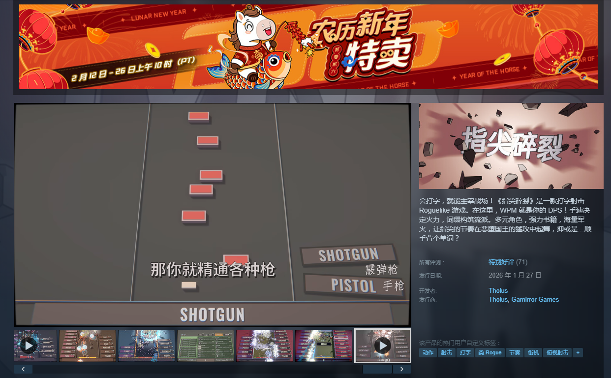 《指尖碎裂》是一款融合高速打字与弹幕射击机制的创新型动作Roguelike游戏,核心玩法围绕“输入即战斗”展开:玩家通过实时键入英文单词、武器名或词缀来触发攻击,WPM(每分钟单词数)直接转化为DPS(每秒伤害),拼写错误将立即中断连击。该游戏已于2026年1月27日正式登陆Steam平台,支持全球用户购买与下载。