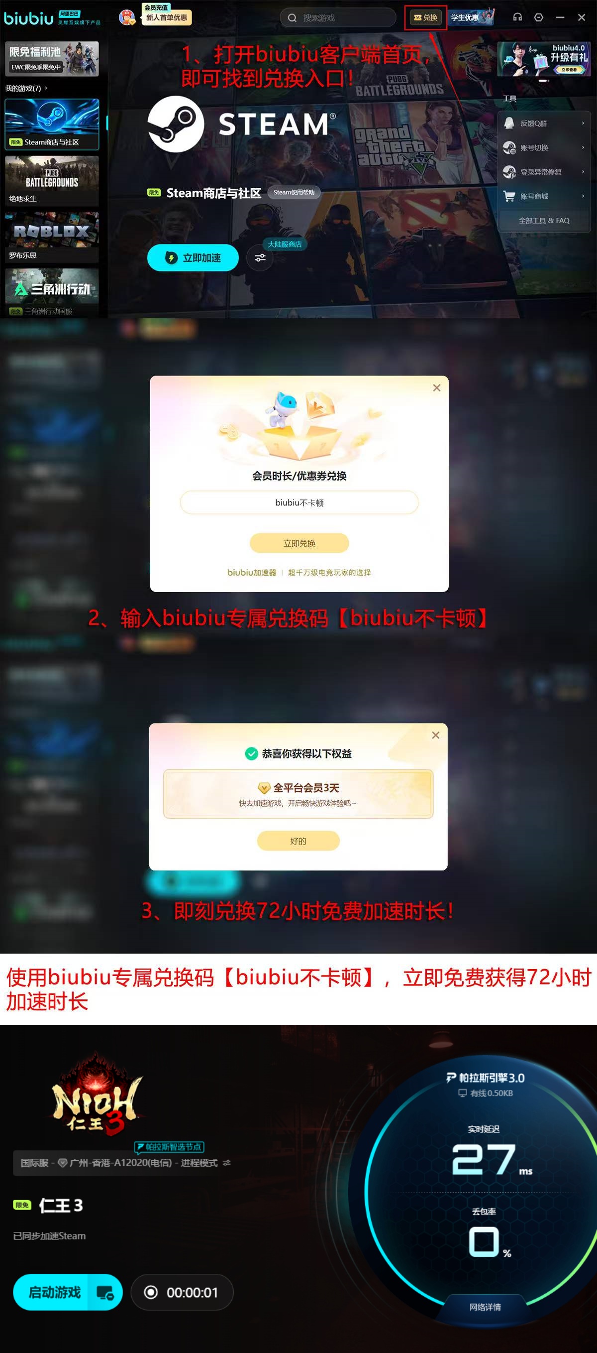 新用户首次启动biubiu加速器即可获赠24小时全游戏免费加速权限。当前平台同步开放限时福利:输入兑换码【biubiu不卡顿】,还可额外领取3天连续加速时长,适用于《仁王3》及其他所有支持游戏。