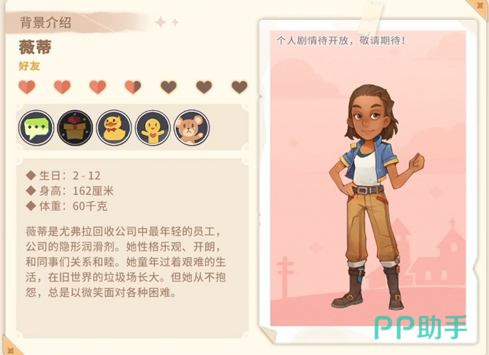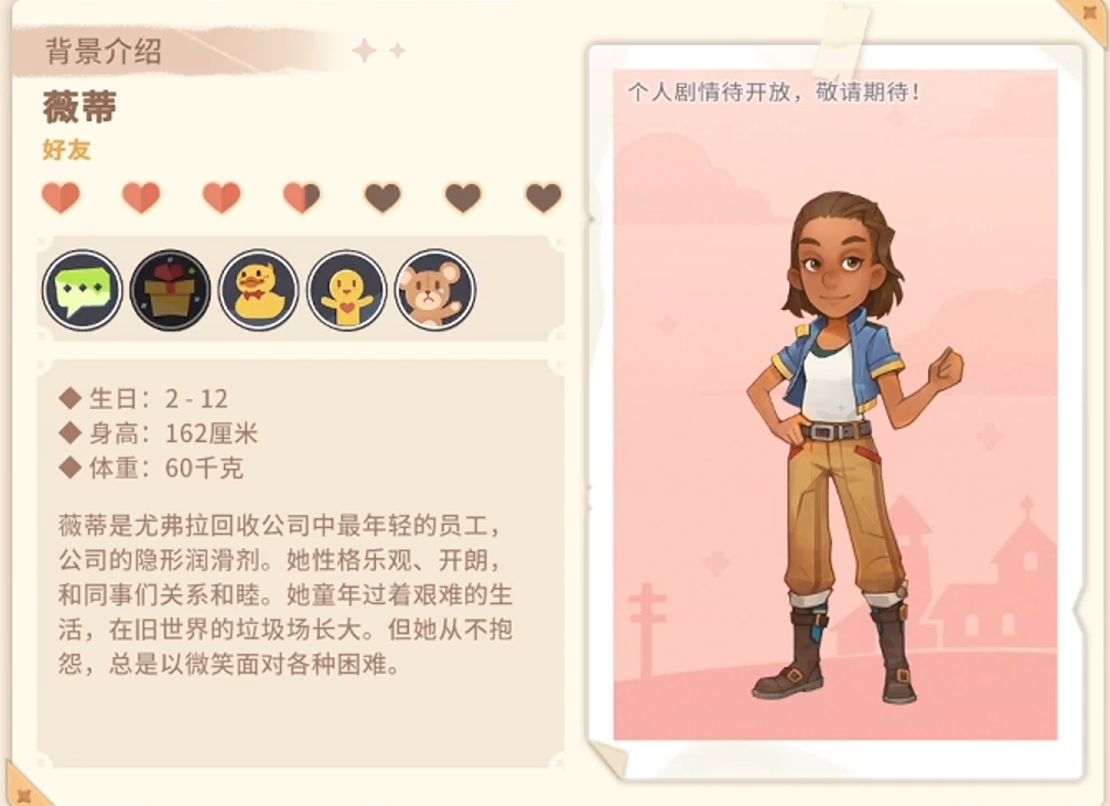 在《沙石镇时光》这款开放世界模拟经营游戏中,NPC薇蒂(Viti)是尤弗拉回收公司的重要成员,性格沉稳乐观,与同事关系融洽。她童年随薇薇奶奶在旧世界垃圾场生活,却始终以积极态度面对困境,这一背景也深刻影响了她对礼物的偏好。许多玩家在推进剧情或提升好感度时,常因送错礼物而效率低下。本文将系统梳理薇蒂的礼物偏好机制,助你高效积累好感、解锁专属互动与剧情分支。