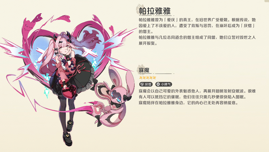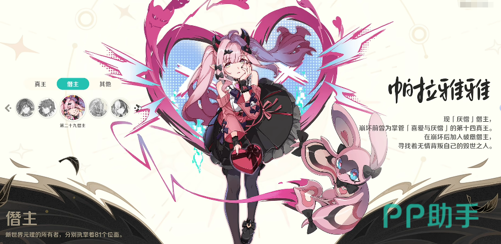 在《崩坏:因缘精灵》的设定体系中,因缘师并非单纯的战斗单位,而是承载世界观核心概念的关键角色。帕拉雅雅作为早期登场的重要真王级因缘师,其身份演变极具叙事张力——当前定位为第29届僭主,司掌“喜爱”与“厌恶”这一组对立情感原型。这种双重权能设定,使其在剧情中呈现出高度敏感的情感感知力,也直接塑造了她从真王跌落至僭主的深层动机与行为逻辑。