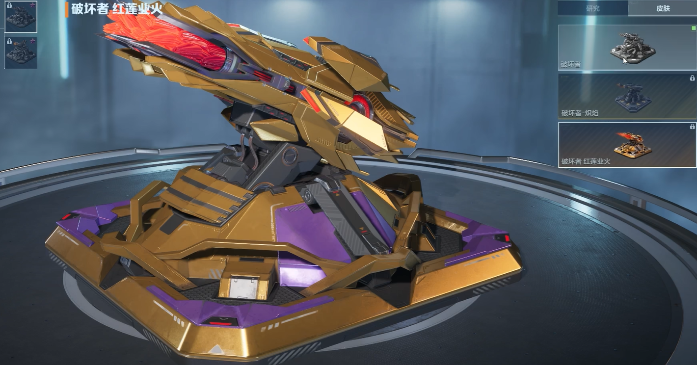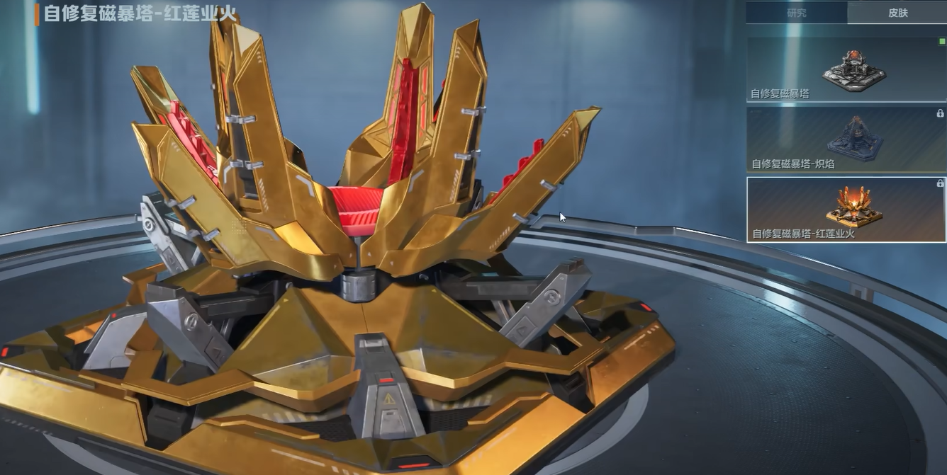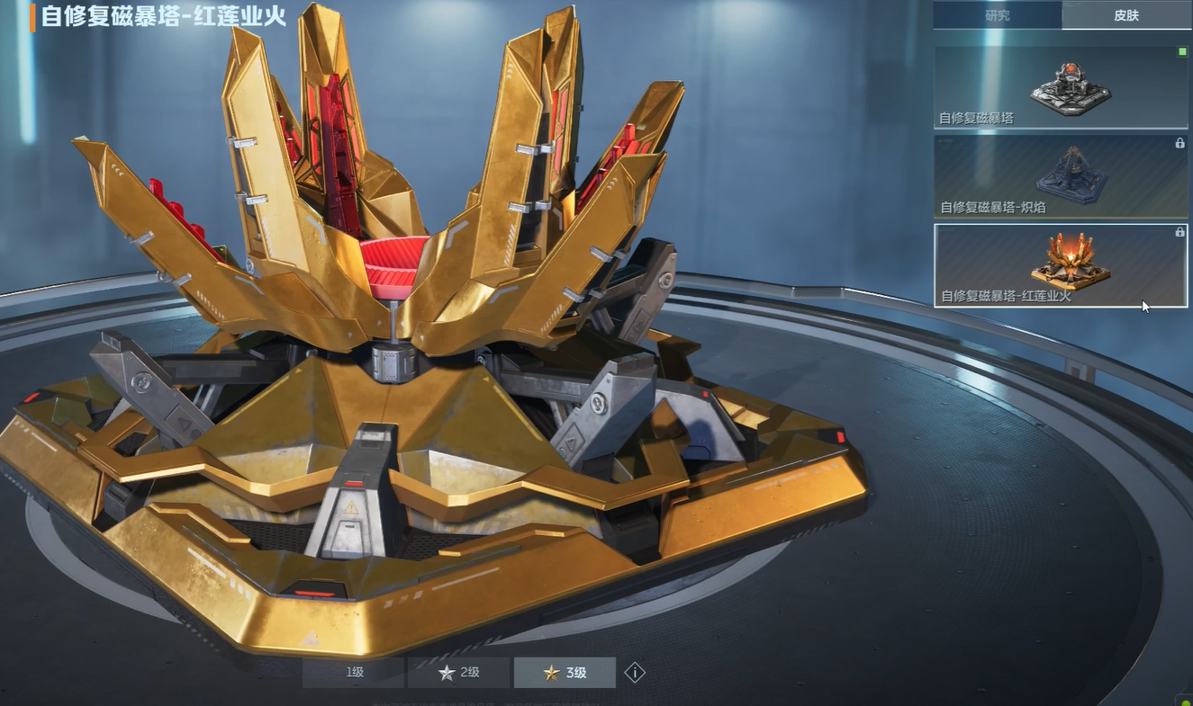红莲业火皮肤采用高饱和度红、黄双主色,模拟跃动火焰的动态质感,摒弃常规冷色调或单色系方案。结构上强化金属骨架与模块化拼接特征,线条锐利、棱角分明,突出科技防御装置的硬核属性。升级系统呈现阶段性视觉演进:二级与三级形态中,底座渐变过渡明显;升至四级满级后,底座统一转为深紫配色,与上部红黄主体形成强对比,同时保持整体色调平衡,提升远距离辨识效率。