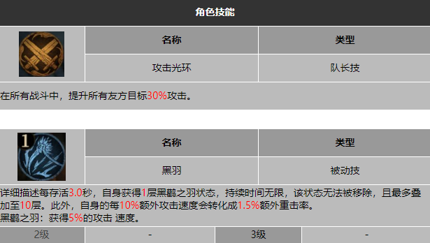 队长技能也是最核心的技能叫做攻击光环,在战斗中可以提升己方所有英雄百分之三十的攻击力,有效的提升整个阵容的攻击力,被动技能叫做黑羽,效果是只要纳斯捷卡在场上存在三秒就可以获得一层的黑鹳之羽状态,并且可以无限持续,但是最多只能叠加到十层,每层增加百分之五的攻击速度,可以随着时间不断提升自身的攻击力。