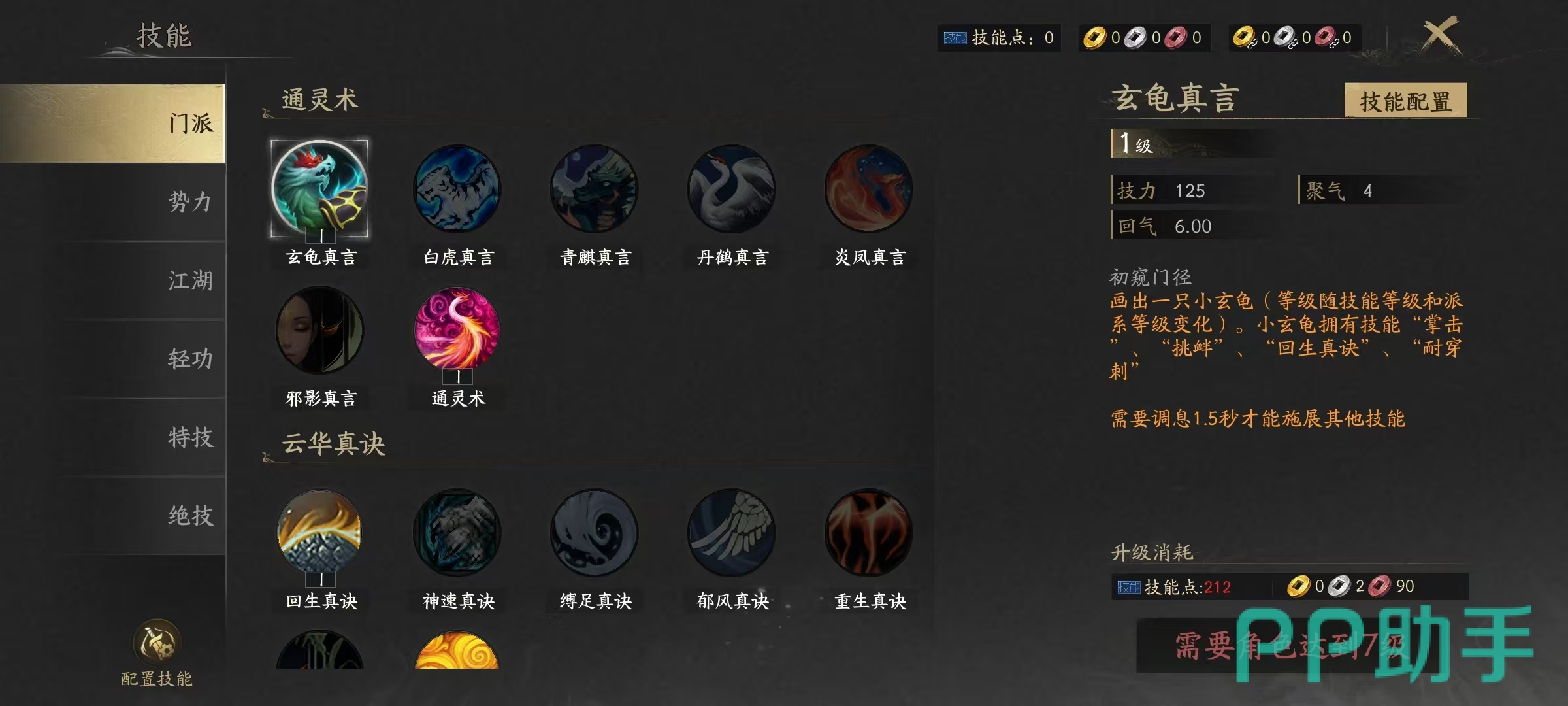 技能体系划分为三大模块:通灵术、云华真诀与八卦咒。通灵术专注灵兽召唤,如玄龟真言赋予护盾与嘲讽,白虎真言强化物理穿透,丹鹤真言提升群体治疗量,青麟真言则增强移动速度与闪避率,适配不同副本环境与PVP场景。云华真诀侧重功能性增益,涵盖回生真诀(持续回血)、神算真诀(暴击率提升)、重生真诀(死亡复活)、心魔真诀(敌方减疗),显著提升团队续航与压制能力。八卦咒主攻爆发输出,代表技能“符惊鬼神”可释放环形冲击波,对目标区域造成高额法术伤害并附带击退效果。所有技能随角色等级逐步解锁,需结合冷却管理与战斗目标进行合理搭配。