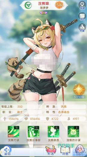 浣熊娘同样为暗属性战士,来自一个鲜为人知的隐秘国度,掌管着生死界限的力量。在副本推进过程中,她以凌厉输出著称;但在面对玩家时,却会展现出难得的柔软一面。她与玩家的羁绊可追溯至一次古老的转生事件——彼时玩家身陷绝境,正是她出手相救,自此成为战场上最值得信赖的主力输出之一。凭借暗属性对光系目标的克制特性,她在对应战局中表现尤为突出。