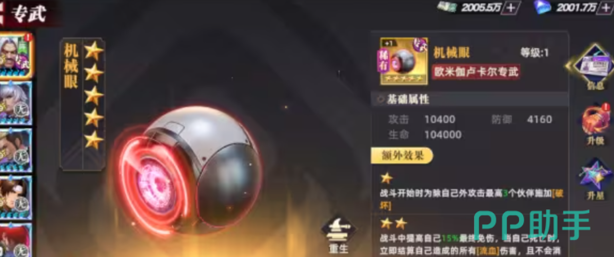 欧米伽卢卡尔专属武器,基础属性扎实:攻击力10400、防御力4160、生命值104000。该武器不仅显著提升单体爆发能力,更具备团队增益机制——装备后,战斗初始阶段即可为除自身外攻击力最高的3名队友赋予“破坏能力”,大幅提升整体输出节奏。升至二星后,额外激活15%最终免伤,进一步强化生存稳定性与持续作战能力。