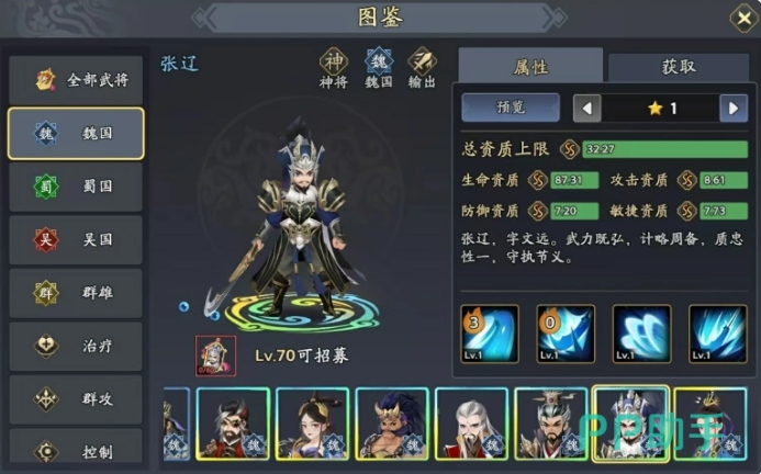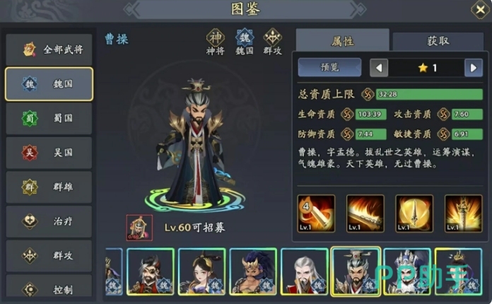 同时他还能够对多个目标造成伤害,并施加其他的附加状态,郭嘉和司马懿这两位辅助武将一起出场,可以对己方队伍进行全方位的增强,在输出方面,曹操和张辽的组合也是不错的,曹操作为群攻类型的输出武将,他的必杀技能够在对敌方全体目标造成巨大的伤害,曹操的必杀技在造成伤害的同时,还能够恢复自身生命值,而且在被动技能的加成下,曹操造成伤害时还有几率为目标施加威压状态,降低对方的敏捷。
