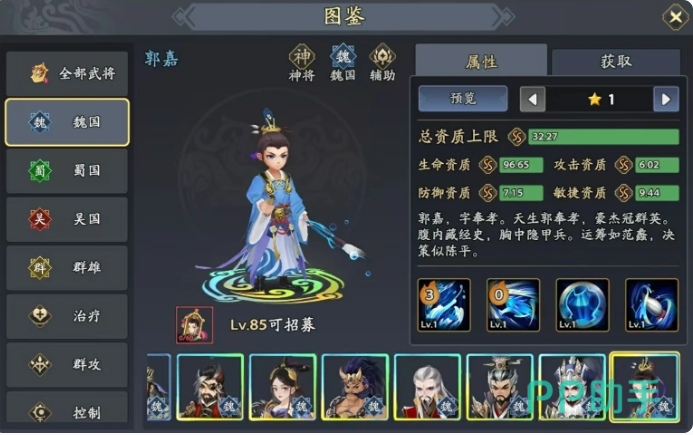 郭嘉在战斗中专注于为己方目标提供悉心的治疗,确保队友们在战斗中能够保持良好的状态,同时他还具备添加抵抗异常状态的效果,此外郭嘉还能够针对单个队友进行单体治疗,并且在关键时刻驱散队友身上的负面状态,而司马懿则完全是另一种风格,他属于进攻类型的辅助武将,在战斗中,马懿犹如一位狡黠的谋士,善于运用各种策略对敌方进行打击,他可以精准地驱散敌方目标身上的增益状态,让敌方的攻击和防御能力瞬间瓦解。