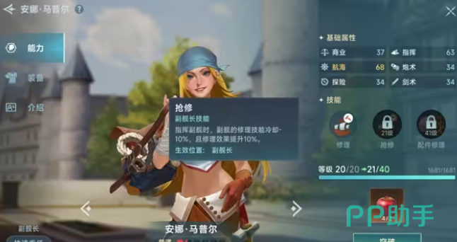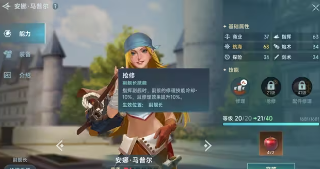 船用机械如复杂的罗盘、控制风帆升降的绞车等,在她眼中如同精密的玩具,她熟悉每一个机械部件的运作原理,能够熟练调试罗盘,确保航行方向的精准无误,对船装满怀热爱的她,拥有天马行空的想象力与独特的审美,她可以根据不同的航行需求,设计出创新的船帆样式,玩家只需跟随游戏主线任务推进,便能顺利将这位充满活力与梦想的船匠招募至麾下。