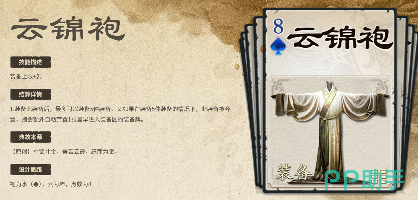 作为典型的土属性防具,【云锦袍】的核心机制在于提升装备携带上限,使玩家最多可同时装配五件装备,相比常规的三件限制有了显著拓展。这一特性极大丰富了构筑策略的自由度,允许角色集成武器、防具、坐骑等多种功能型装备,适应复杂多变的对局环境。值得注意的是,在结算阶段若弃置已满配状态下的【云锦袍】,系统将额外移除最早置入装备区的一张牌,呼应了土属性“厚积而后损”的哲学逻辑,强调长期积累后的有序释放。