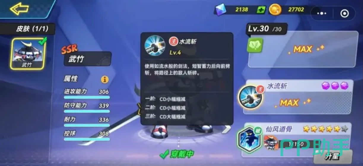武竹在靠近对方两分区时表现尤为出色,后仰跳投不仅命中率提升,还会伴随一段后撤位移,结合其基础属性,使其成为中距离得分的稳定选择。技能“水流斩”需短暂蓄力后向前劈砍,命中敌人可将其击倒,若对方持球则强制掉落。普攻为三段式连击,第三段具备击倒效果及小范围穿透伤害,适合打乱敌方节奏;