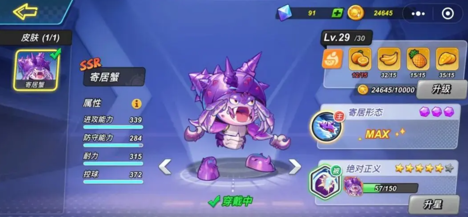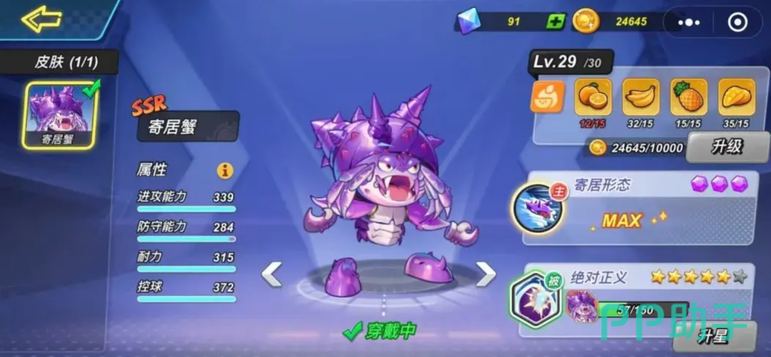 被动技“绝对正义”在成功普攻三次后使目标陷入中毒,降低移速并持续损失体力,持续时间为3秒。当寄居蟹升至4星后,仅需两次普攻即可触发中毒效果。可抓住对手灌篮后短暂硬直期,迅速衔接两次普攻将其控制,实现高效压制。