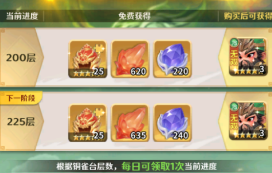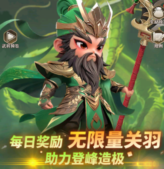 玩家可通过主城活动入口参与限时活动“无限关羽”,稳定获取该角色。此外,“铜雀台”副本为重要资源产出渠道,通关至第10层后即可开启每日奖励领取,奖励池涵盖稀有武将碎片、进阶材料及随机SSR武将,关羽亦在此概率范围内。