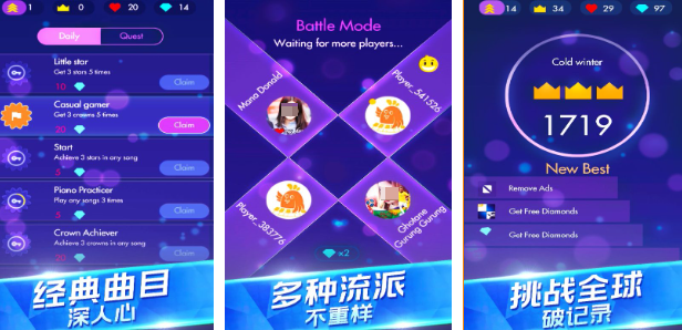 游戏中还会加上联网对战的玩法,让玩家在演奏的时候并不会如此的单调,而是可以享受全球竞技盛宴。玩家就可以选择一起去争夺排行榜,获得后期的荣誉。游戏里面还有丰富的流行歌曲以及钢琴名曲,玩家在点击的过程中都可以弹奏出一些动人的旋律,会拥有一种沉浸式的音乐体验。除了大家所喜欢的对战模式之外,还有趣味性的挑战模式。