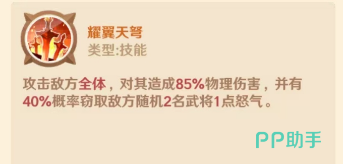 该技能另一不可忽视的价值在于怒气窃取效果:每次释放有40%概率从敌方两名武将处夺取怒气。该机制虽非必中,但在高频释放节奏下实际触发率可观。成功触发后,不仅能延缓对手大招释放节奏,还可为我方创造先手压制窗口。当孙尚香升至九星并完成天赋强化后,所窃取怒气将自动转移至己方物理攻击最高者,从而显著加快全队技能循环速度,形成持续压制链。