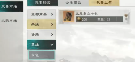 交易市场商品类型覆盖全面:涵盖英雄卡包(如热度持续走高的“三足鼎立”限定卡包)、武将碎片(含孙策、郭嘉等高人气角色)、稀有度分级道具(橙色及以上品质装备与符印)、以及关键养成资源(突破石、升星丹、兵书残卷等)。所有商品明码标价、实时刷新,支持按武将名称、道具类型、稀有度、价格区间多维筛选,大幅缩短目标资源检索时间。