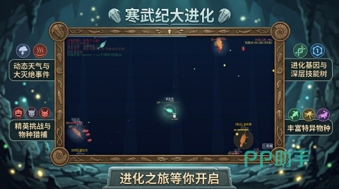 本作严格锚定距今约5.41亿年前的寒武纪时期,所有生物形态、生态位关系及环境参数均依据近年发表的古生物论文与地层学数据校准。玩家将从最原始的单细胞生命体起步,在远古海洋中完成觅食、避敌、增殖等基础生存行为,并逐步触发符合自然选择机制的演化跃迁。游戏中可解锁的全部物种均对应已知寒武纪化石记录中的真实属种,每一次形态变化都同步呈现对应的古生物学注释,实现玩法与科普的高度融合。