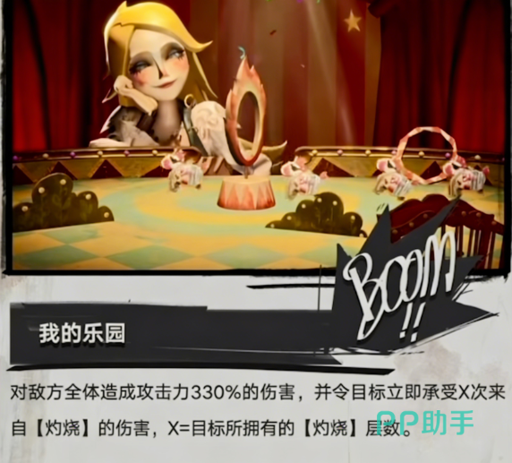 终极技能【乐园】为全屏范围攻击,基础伤害倍率为300%;技能生效时,受击敌人数量越多,叠加的燃烧层数越可观,进而提升持续灼烧伤害总量;若队伍中存在对应羁绊关系,还可额外激活“激昂”状态,触发一次追加攻击。