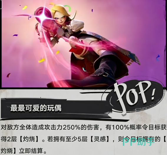 主动技能【最可爱玩偶】具备稳定群攻特性:召唤玩偶发射导弹,对范围内全体敌人造成伤害,最高倍率可达250%;命中后自动施加2层灼烧效果;当目标累计叠加至5层灼烧时,立即触发一次额外灼烧结算。