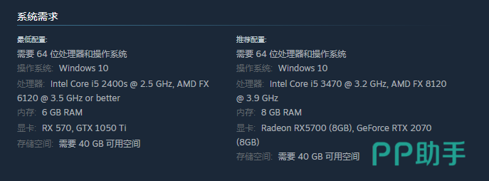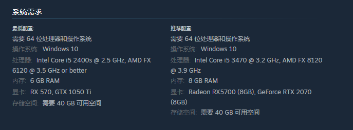 要想体验这款游戏就需要满足最低的配置,需要64位处理器,还有操作系统,操作系统可以选择Windows 10,此外还需要选择处理器,处理器是选择Intel Core i5 2400s @ 2.5 GHz,,显卡方面可以选择RX 570, GTX 1050 Ti,储存空间没有太多的限制之处,一般满足40 GB就已经足够。