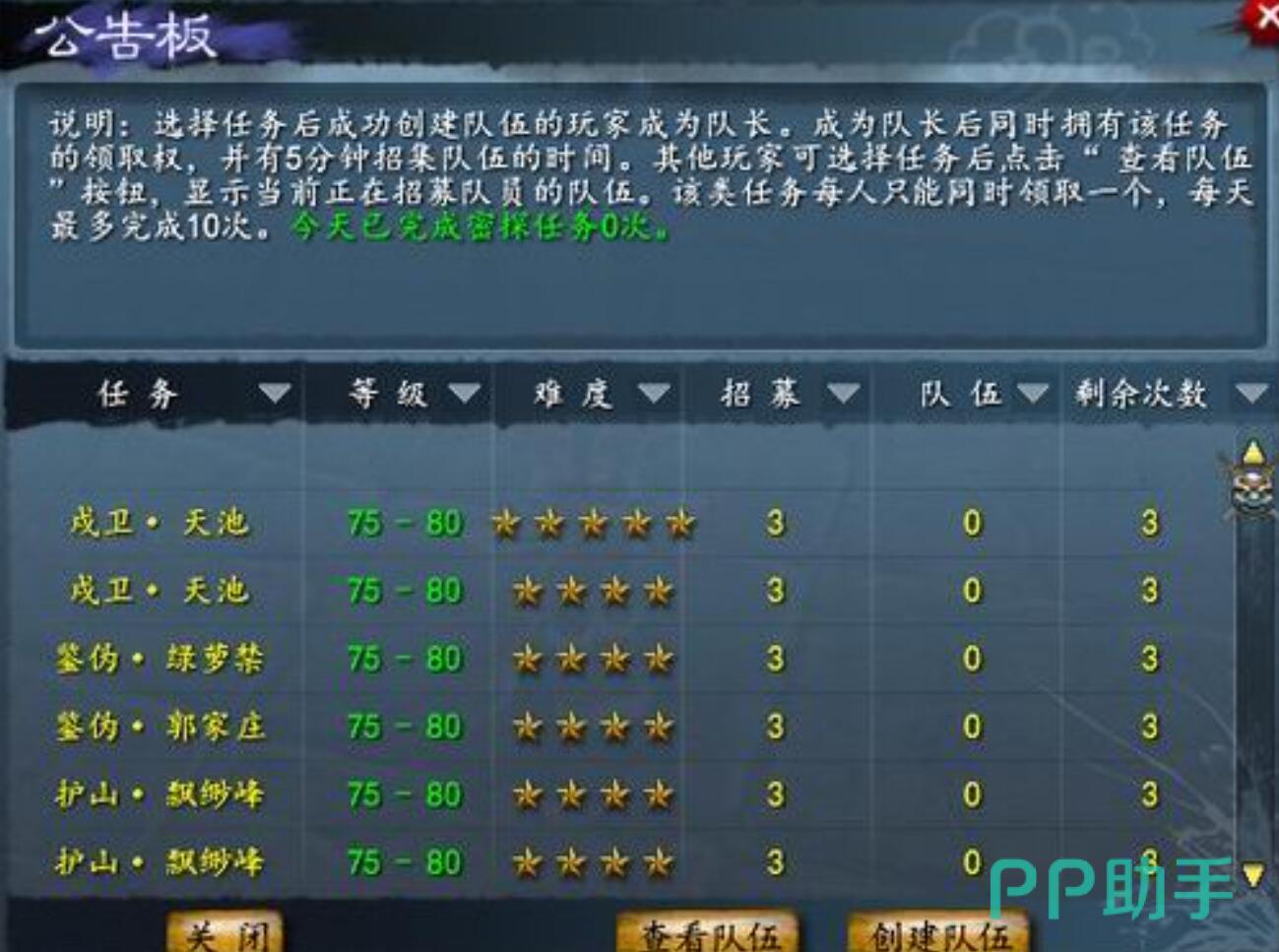作为强制组队类玩法,密探任务对参与者的等级门槛与队伍规模均有硬性规定:仅当角色达到指定等级后,方可接取对应层级的任务;同时,不同地理区域设定差异化人数要求——例如中原、江南等中低难度地图,最低组队人数为2人;而雁门、幽州等高风险区域,则须至少3人组队方可开启任务流程。