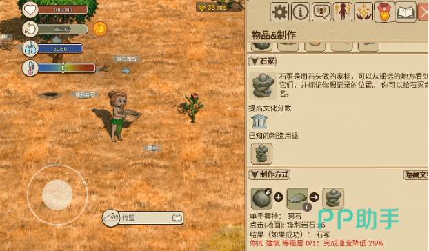 初期的工具制作系统循序渐进,从简单的手工制品起步,随着经验积累逐步解锁更复杂的设备。例如,草碗作为储存食物的基础容器,在早期生存中扮演着不可或缺的角色。所有可制作物品均可在界面中的制作栏查看所需材料及步骤。同时,务必关注角色状态栏中的生命值与饥饿值:当饥饿值下降时应及时进食补充体力;若遭遇伤害,则需使用采集到的草药进行治疗恢复。新人玩家推荐加入新手部落,在真实环境中边学边练,更快熟悉各项操作流程。