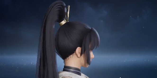 整体造型以“黑金双色”为视觉锚点,摒弃繁复堆砌,强调线条张力与留白节奏。上身采用利落剪裁的长款外袍,下摆垂坠感自然,兼顾古风衣袂飘然之韵与游侠行止如风之态。人物气质沉稳内敛却不失锋芒,精准契合“江湖隐士+轻甲武者”的双重身份设定。发型部分选用高束马尾结构,发根处嵌入哑光金属发圈,细节精炼,无冗余装饰,进一步强化整体简约高级感。