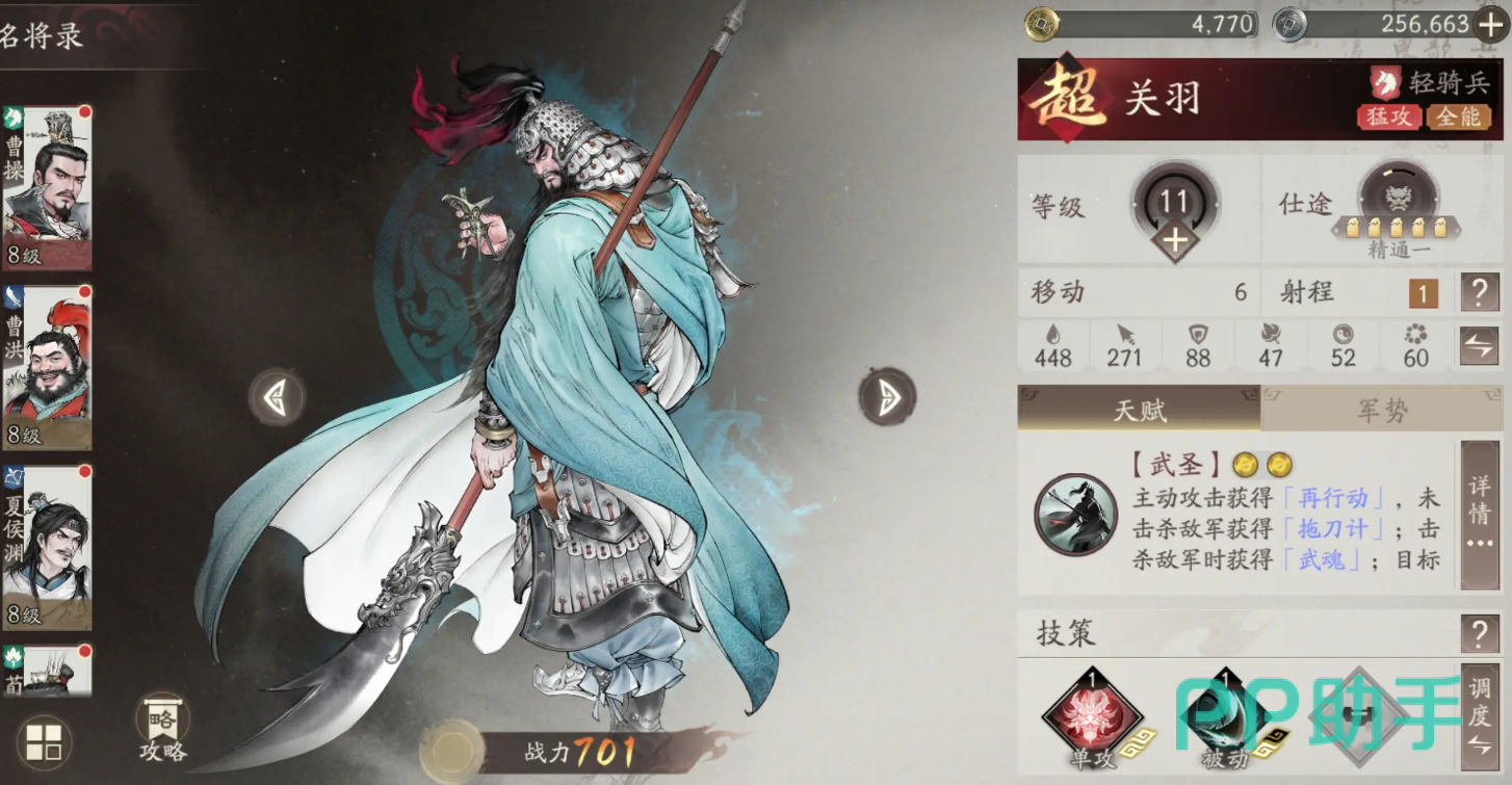 周仓的基础属性表现为:物理攻击9点,兵力19点,物理防御3点。虽然防御能力偏弱,但其核心优势在于满级后的“奋迅”天赋。该效果可在战斗中触发“再行动”或“继续行动”机制。“再行动”允许主将在完成回合后额外获得一次完整行动机会;而“继续行动”则让主将能在当前回合内利用剩余移动力再次执行操作,极大提升了战术灵活性。