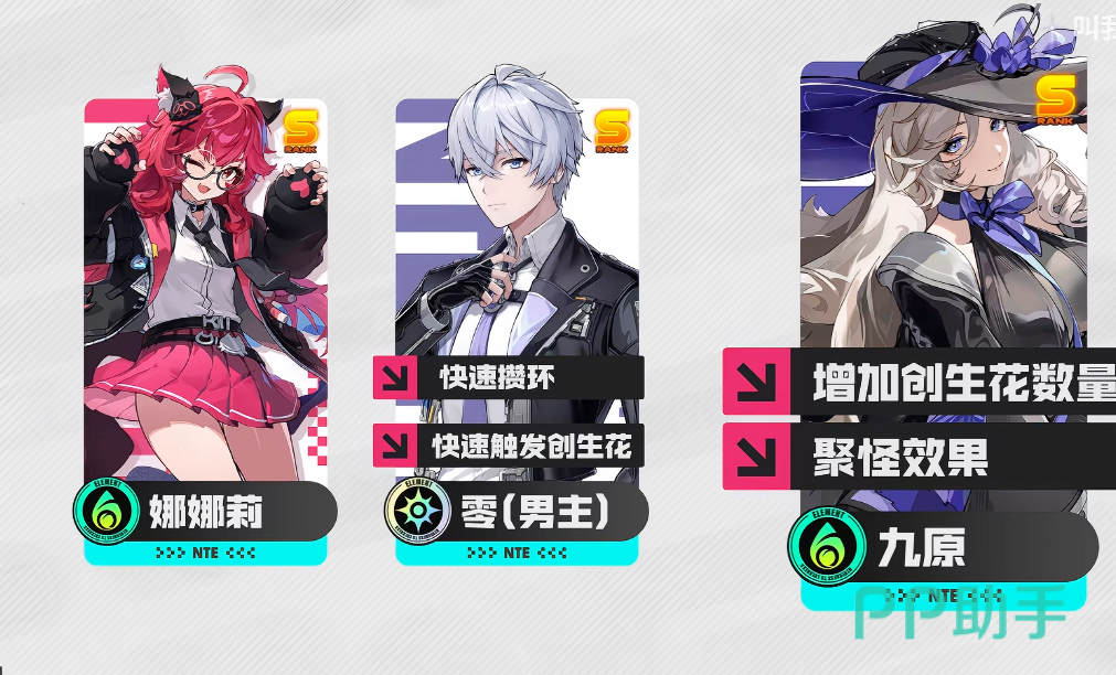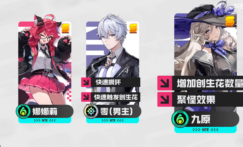 推荐标准三角色创生队构成为:主角+九原+早雾。其中主角为全服通用角色,无需额外抽取,其技能具备短CD、高响应联动性,可在娜娜莉技能间隙迅速补位,触发额外创生花生成,并依托会能机制填补输出真空期,保障整套循环节奏流畅不中断。