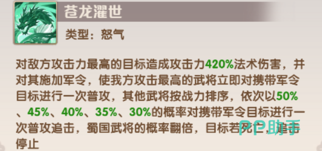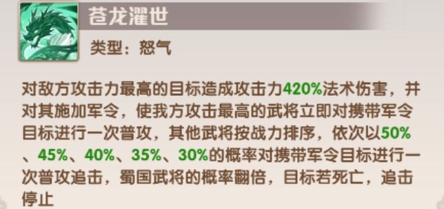 其怒气技能不仅造成高额单体法术伤害,更关键的是内置“尊令”效果:当队伍中攻击最高的武将完成一次普通攻击后,其余我方武将将依战力由高到低依次发动追击;该连锁过程将持续至目标单位被击倒为止。此机制高度契合蜀国武将普遍具备的高频率攻击与协同输出特性,极大强化了蜀系阵容的整体节奏感与爆发连续性。