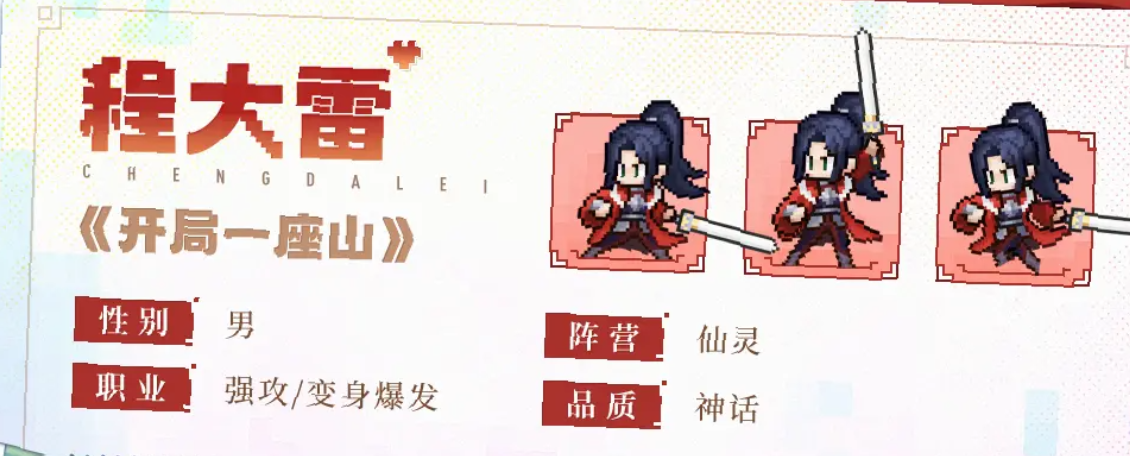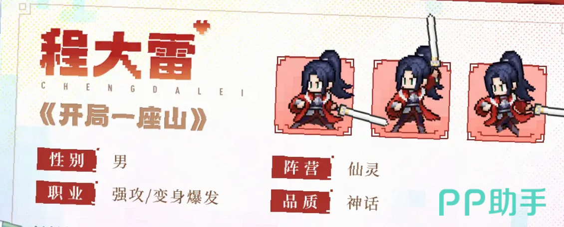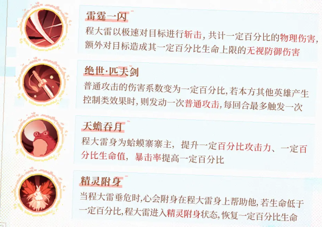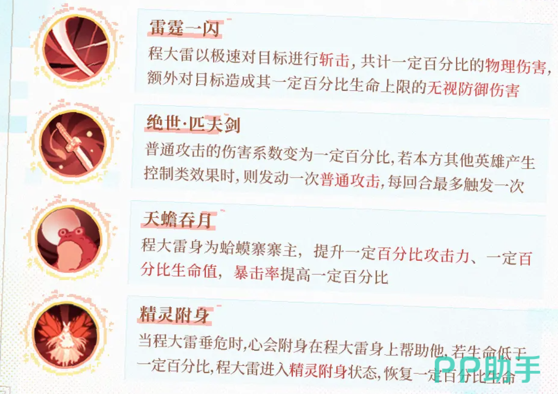 程大雷是一位高爆发的英雄,在整个队伍中他也可以作为辅助。要说他的技能是特别全面的,比如他能够有比较强大的输出能力,因为他能够对敌人快速的斩击,给敌人造成一定比例的物理伤害。他还能够给敌人造成生命上限。毕竟雷霆一闪作为程大雷的主要输出方式,能够削减敌人的生命值,特别是那些防御值比较高的敌人。
