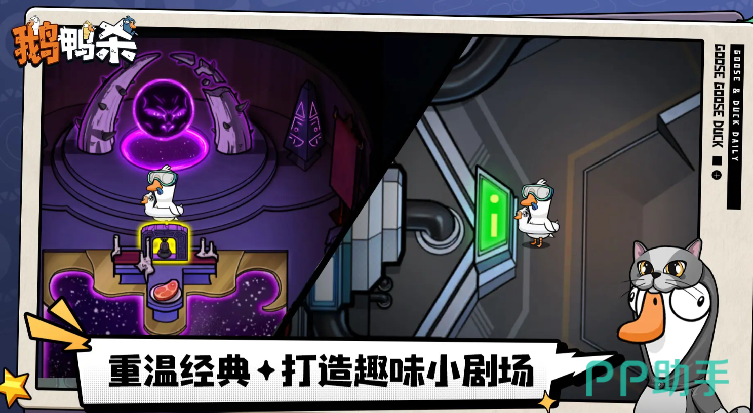 游戏开始后首先进入自由行动阶段。地图中分布着各类任务点,鹅可以前往执行任务推进进度,而鸭子可选择破坏设施制造混乱,或直接发动攻击。普通鸭子的击杀技能有17秒冷却时间(无特殊身份加成),被击杀的玩家会在原地留下尸体标识。