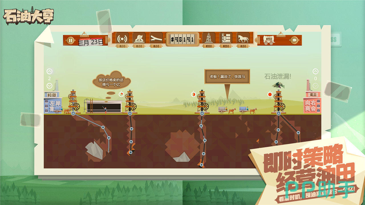 游戏中一般会提供两家收购石油的公司,根据石油的报价和运输成本进行分析,尽量减少马车的运输成本,这样才能获得更高的利益去购买设备,拓宽开采的范围和提高开采时间。卖石油的操作非常的简单,但是对于如何有效开采石油才是游戏的关键。