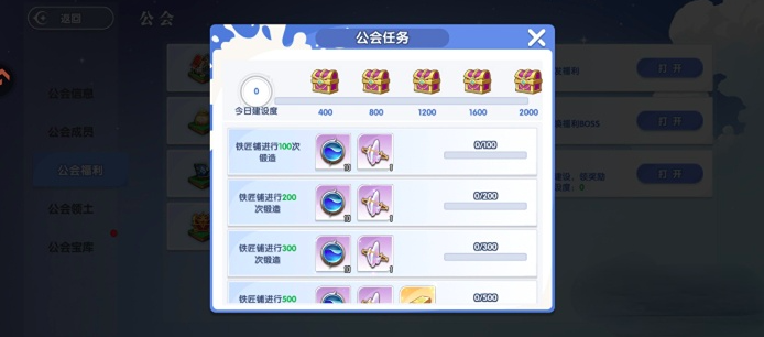 公会建设值是贯穿整个系统的底层货币。玩家每日需前往铁匠铺、维克多农场等指定场景完成任务,单次任务产出建设值区间为100至500点。每累积满400点建设值,即可解锁一个宝箱。该机制确保日常活跃度直接转化为实质性成长收益,所获内容包括经验、钻石、高品质背饰及实用级武器装备,全面覆盖角色养成刚需。