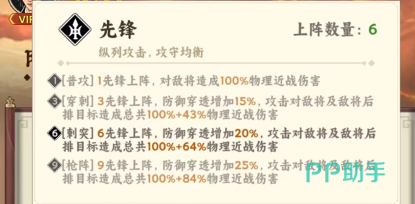 该阵容的核心机制围绕两大特性展开:一是“防御穿透”类羁绊效果,二是“纵列攻击”打击模式。具体而言,上阵3名先锋武将即可激活【穿刺】效果,提升全体15%防御穿透;达到6人时解锁【突刺】,额外增加20%穿透并附带后排波及伤害;集齐9名先锋则触发终极羁绊【枪阵】,穿透值进一步提升至25%,对高护甲目标具备极强压制力。所有先锋系武将均易于获取——系统首周任务赠送、日常战斗商店稳定兑换,无抽卡或活动限定限制。