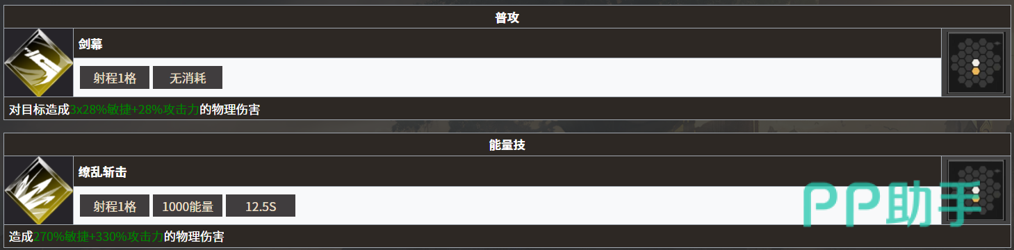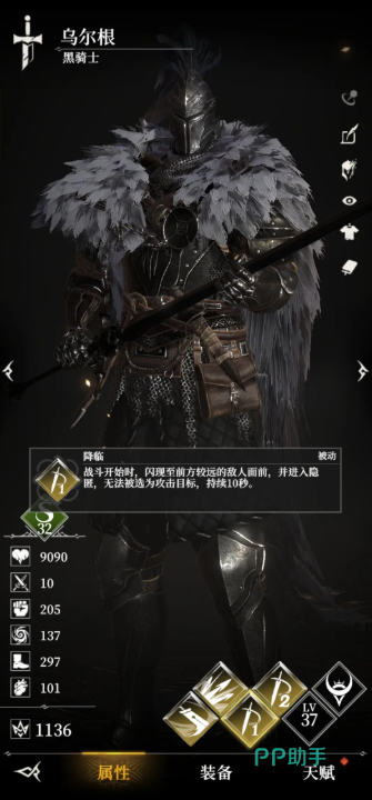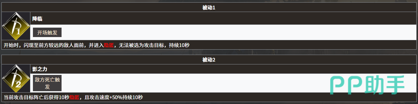 在技能体系方面,黑骑士归属于暗影系职业。普攻“剑幕”消耗低且输出稳定,可获得3x28%的敏捷加成,并基于基础攻击力持续造成伤害,适合长时间站场输出。能量技“缭乱斩击”则是主要爆发手段,融合270%敏捷与330%攻击力的复合倍率,附带溅射效果,能对多个敌人造成高额范围伤害。此外,两个被动技能赋予他在开局阶段闪现并进入隐匿状态的能力,使其能在首轮集火中成功规避致命打击,极大提升了生存概率。